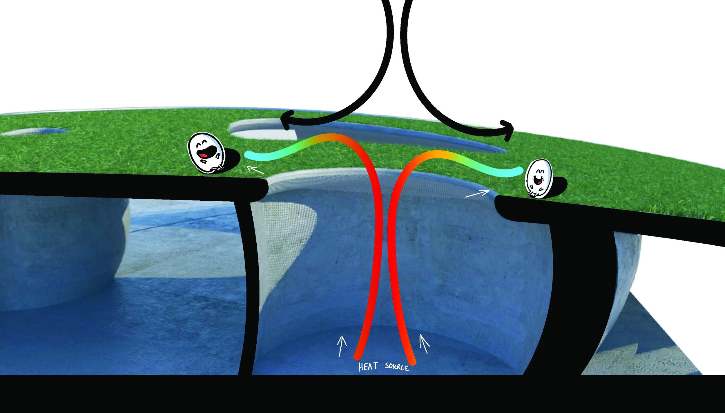 Using convection as a driving design element, this Spa and Boathouse features a walkable green roof with a mesh covered exhaust ports, allowing for hot air to rise and to be experienced on the roof. The flow of movement was inspired by heat as well, looking at how heat maps show the flow of cold/hot water being mixed together. The Spa/Boathouse also includes an indoor pool, outdoor pool, sauna, bathrooms, showers, main office, storage, and a rowing training center.